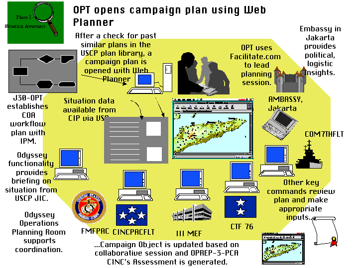 In order to guide the process of building the campaign plan, the J30-OPT utilizes the IPM tool to develop a workflow plan for the COA development. The J30-OPT also uses the Facilitate.com application in conjunction with the Odyssey Operations Planning Room and the Web Planner to coordinate input on the situation from members of the OPT. Facilitate.com is a conferencing tool for managing a group discussion. Included are a brainstorming tool for generating ideas and a voting tool for ranking these. With these tools, the OPT will develop the specified and implied tasks for a Drapan rescue. The OPT will also make a “first cut” selection of forces for assignment to the JTF using the Force Management Tool (FMT). These and other key planning considerations developed during the session are incorporated into the Campaign Object via the Web Planner.